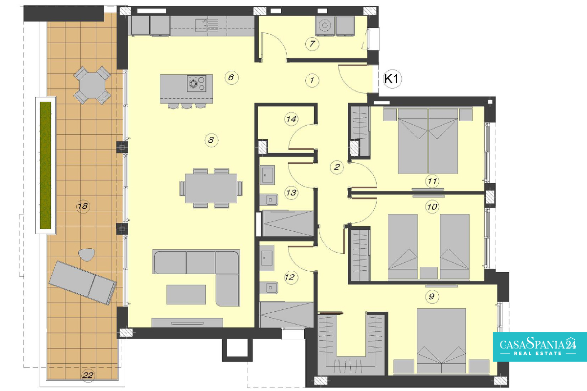 The apartment consists of 3 spacious bedrooms and 2 modern bathrooms, with an open plan kitchen that extends to the living and dining area. This configuration creates an airy and bright space, perfect for relaxing and socializing. In addition, the home includes a veranda and a terrace, ideal for enjoying the sunny atmosphere of the area, as well as an underground parking and a storage space.