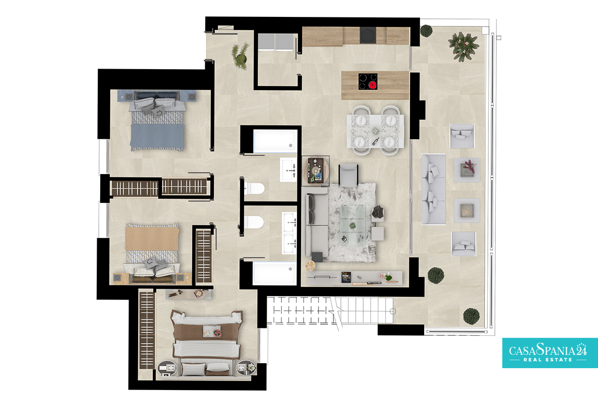 The apartment has a large terrace with a glass balcony so you can fully enjoy the fabulous views of the golf course. It is ideal for families looking for a holiday home or investors looking for a summer rental property with a good return.