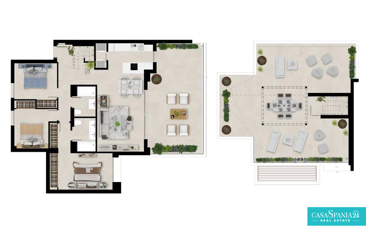 Penthouse apartment with 3 bedrooms, 2 bathrooms, kitchen opening onto the living room, 43 sqm terrace, 69 sqm solarium. The home also has a storage room and a parking space in the garage. The home is delivered fully equipped, with high-quality branded finishes.