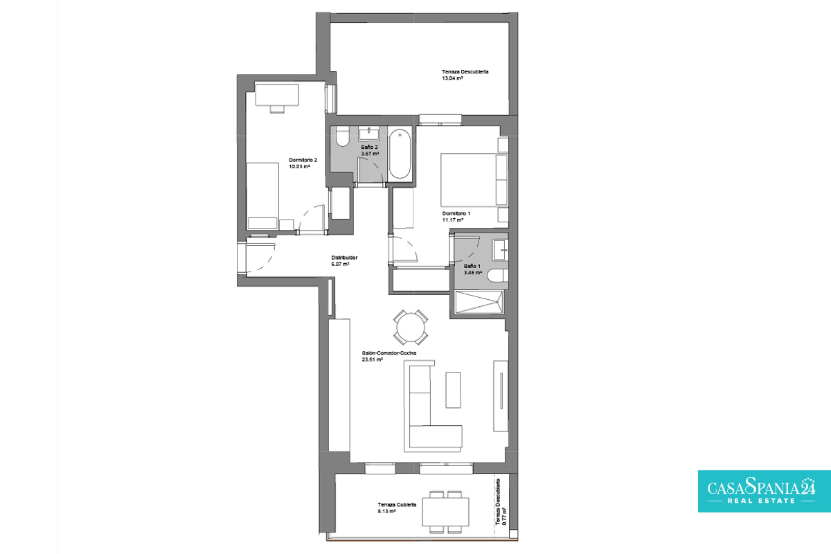 Apartment with 2 bedrooms, 2 bathrooms, living room with dining area, kitchen, two terraces of 13 m² and 8 m², parking space and storage space. The property is south-facing.