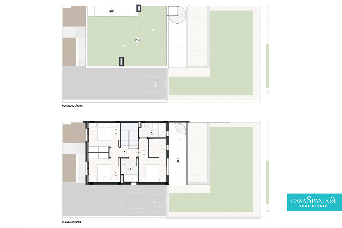 This modern villa has 3 bedrooms and 2 bathrooms located on the first floor, plus an additional toilet on the ground floor. The living area is open and welcoming, with a fully equipped kitchen integrated into the living room, providing an ideal space for spending time with family or friends. The generous terraces and 49 m² solarium are perfect for relaxing outdoors and enjoying the mild Mediterranean climate.