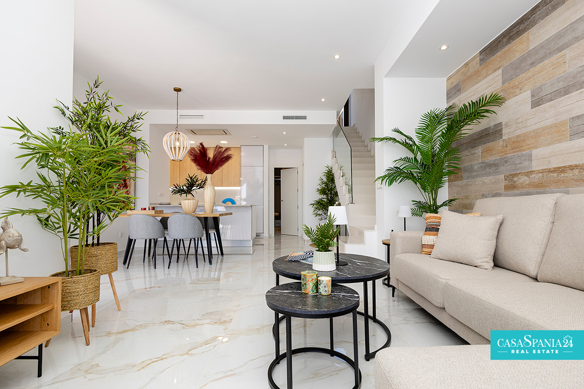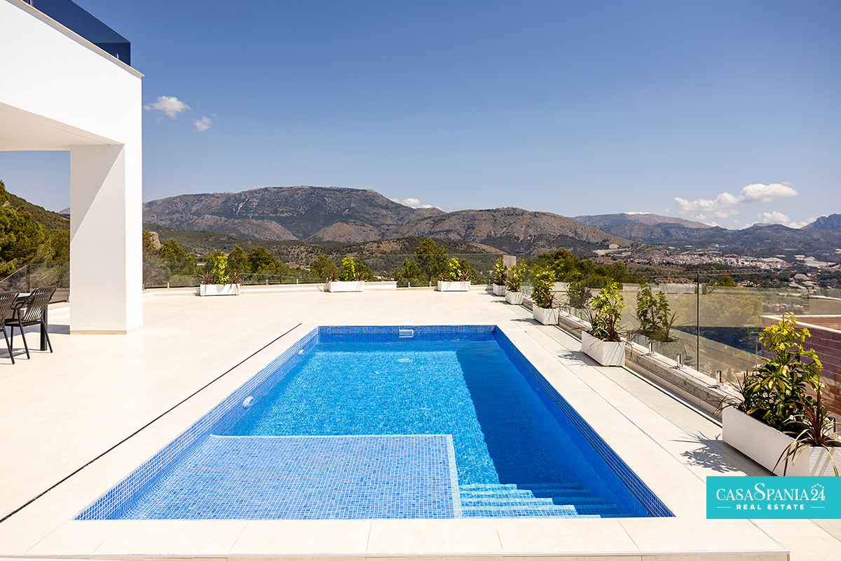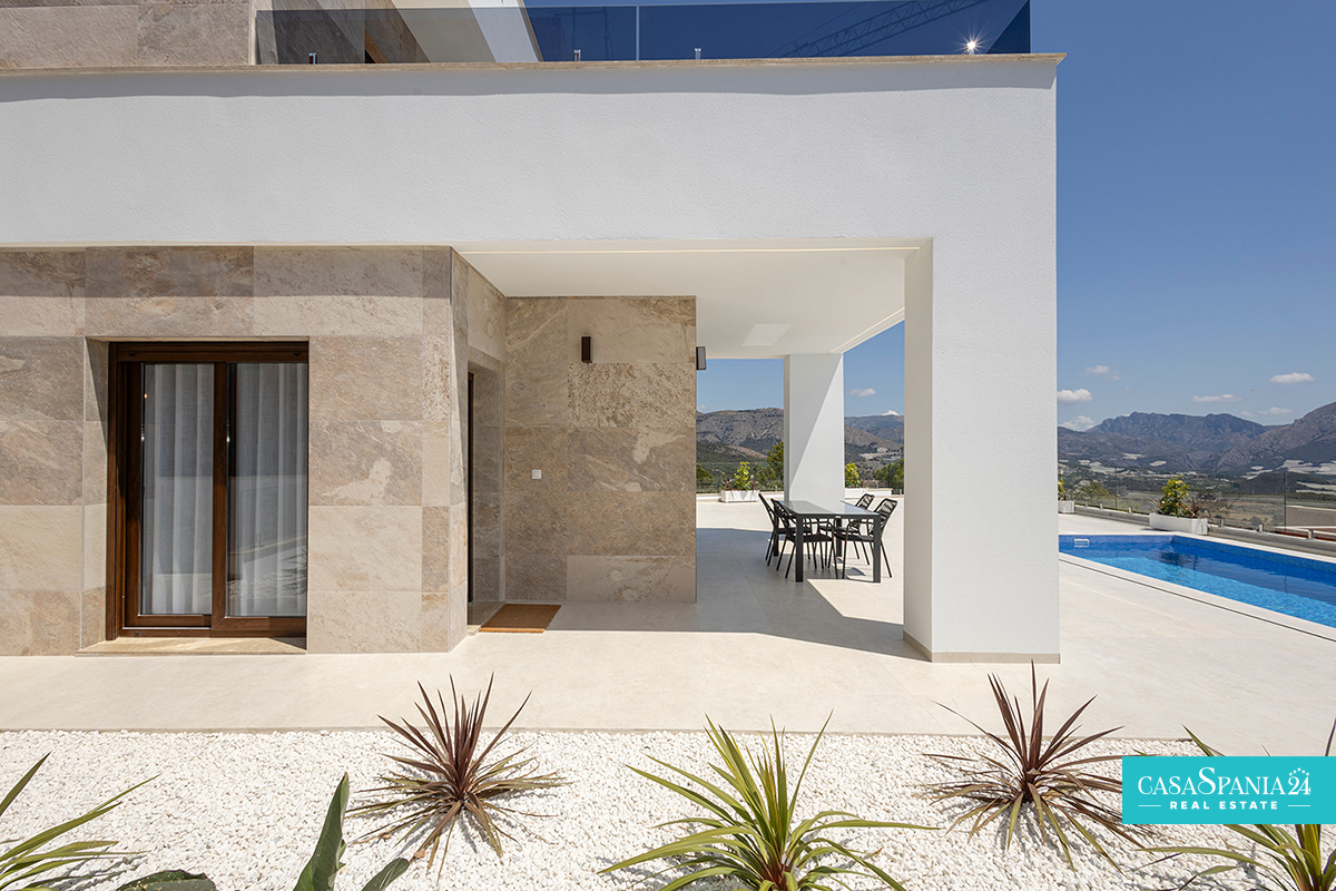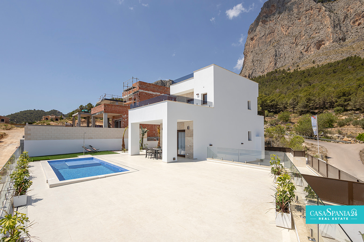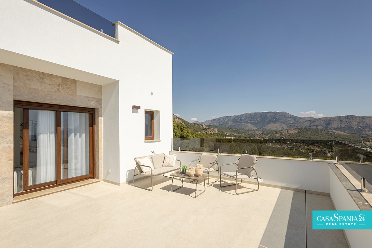 This newly built luxury villa is located in the picturesque town of Polop de la Marina, Alicante. Designed for comfort and elegance, this property offers 129 m² of built area on a private plot of 400 m², providing generous space for relaxation and leisure.