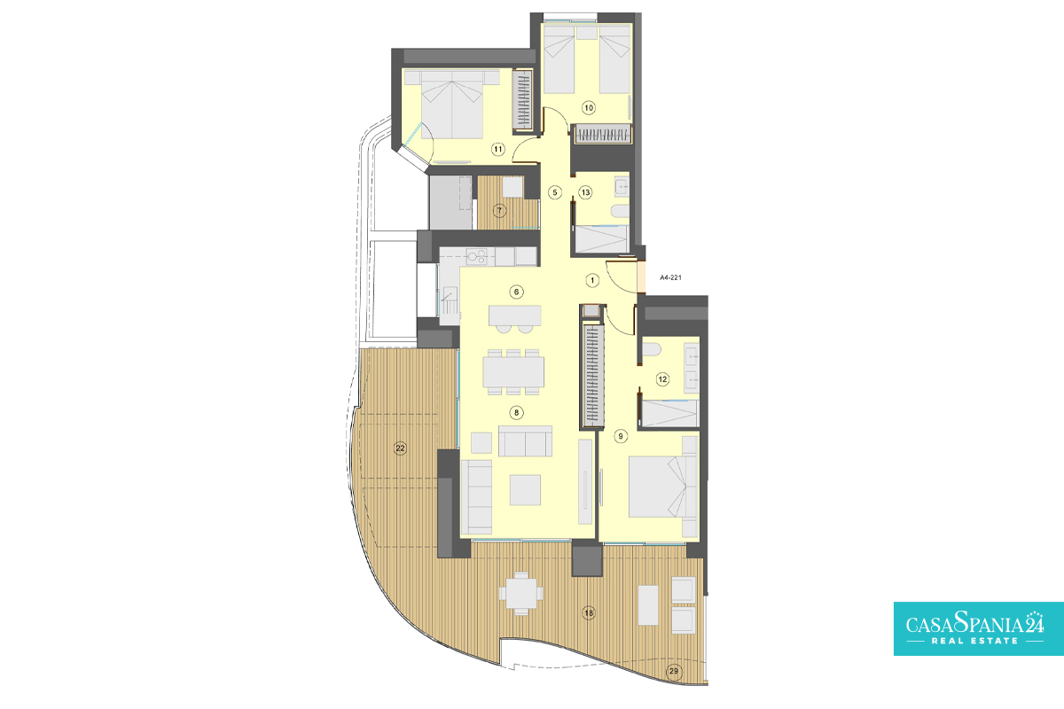 This elegant 3-bedroom, 2-bathroom apartment is ideal for those looking for a modern home on the seafront. The spacious living room, dining area, fully equipped kitchen and 41 m² terrace with spectacular sea and city views provide the perfect setting for relaxation and daily comfort.