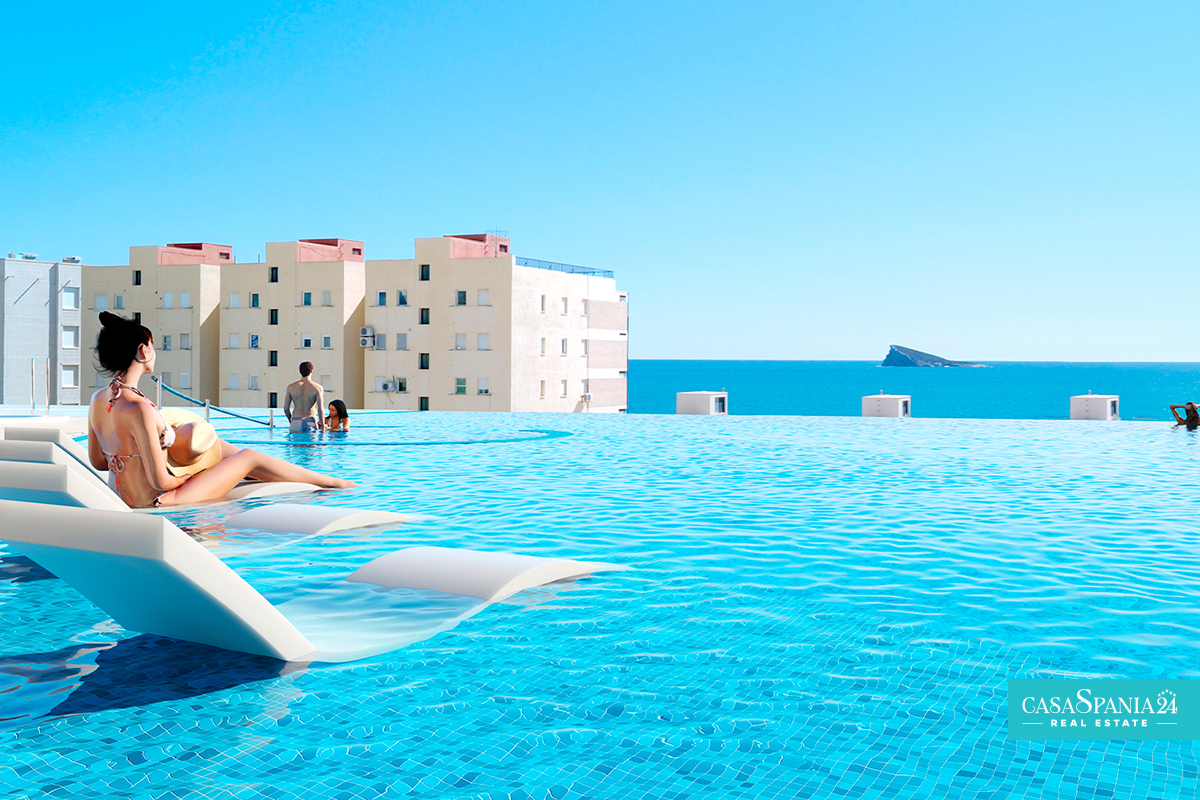 2 bedroom 2 bathroom apartment with amazing sea and city views and great communal areas. It is located on the seafront in the center of Benidorm, very close to beaches, restaurants and shops.