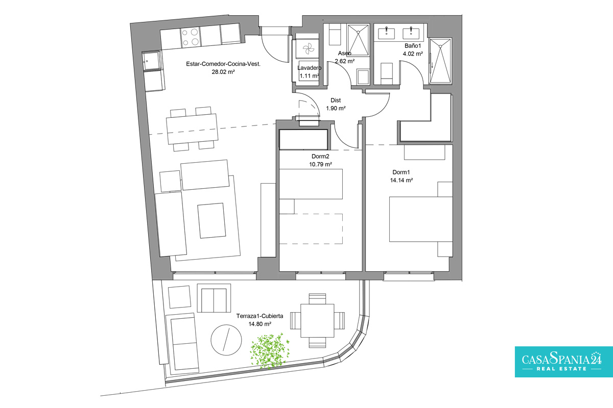 Complete contemporary style apartment with 2 bedrooms, 2 bathrooms, open plan living room + designer kitchen, 14 sqm.