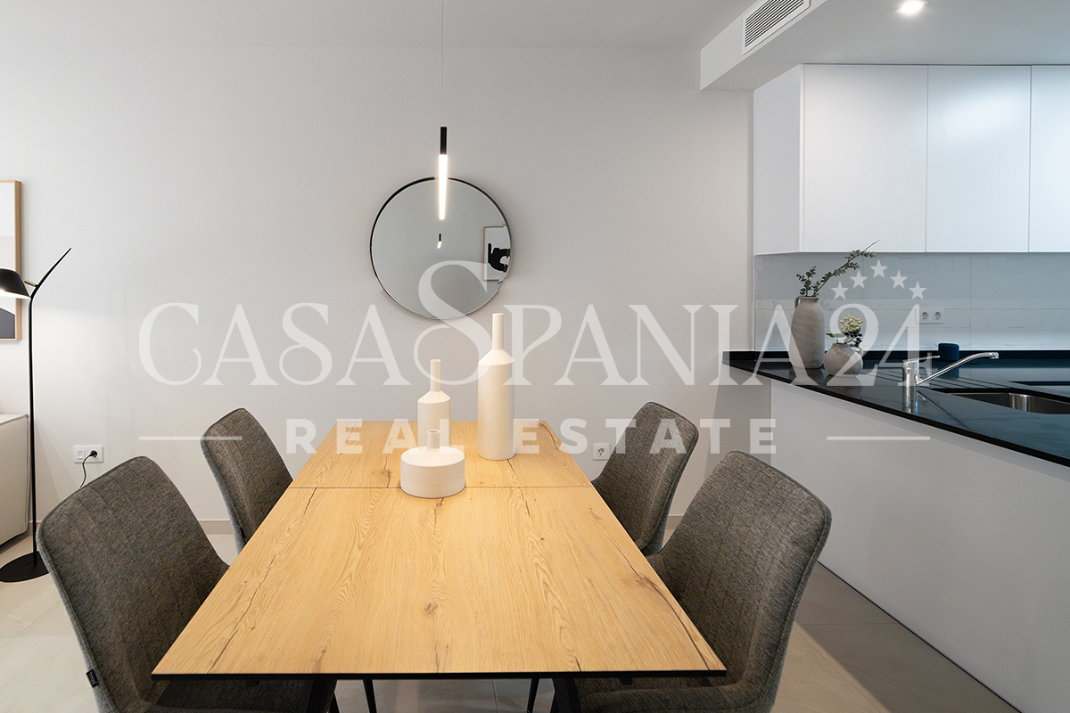 The kitchen is fully fitted with base and wall to ceiling units with a decorative stainless steel hood, quartz worktops (Silestone, Compact or similar) with sink and drainer, it also has an extension to the dining room forming a breakfast bar with LED lighting (*choice of colors available for kitchen units and worktops at no extra cost according to the personalization catalog). Pre-installed ducted air conditioning (hot/cold) and distribution grids.
