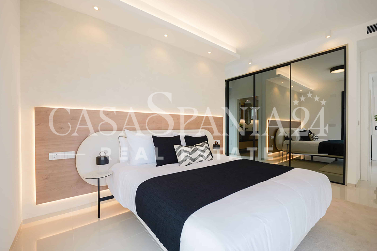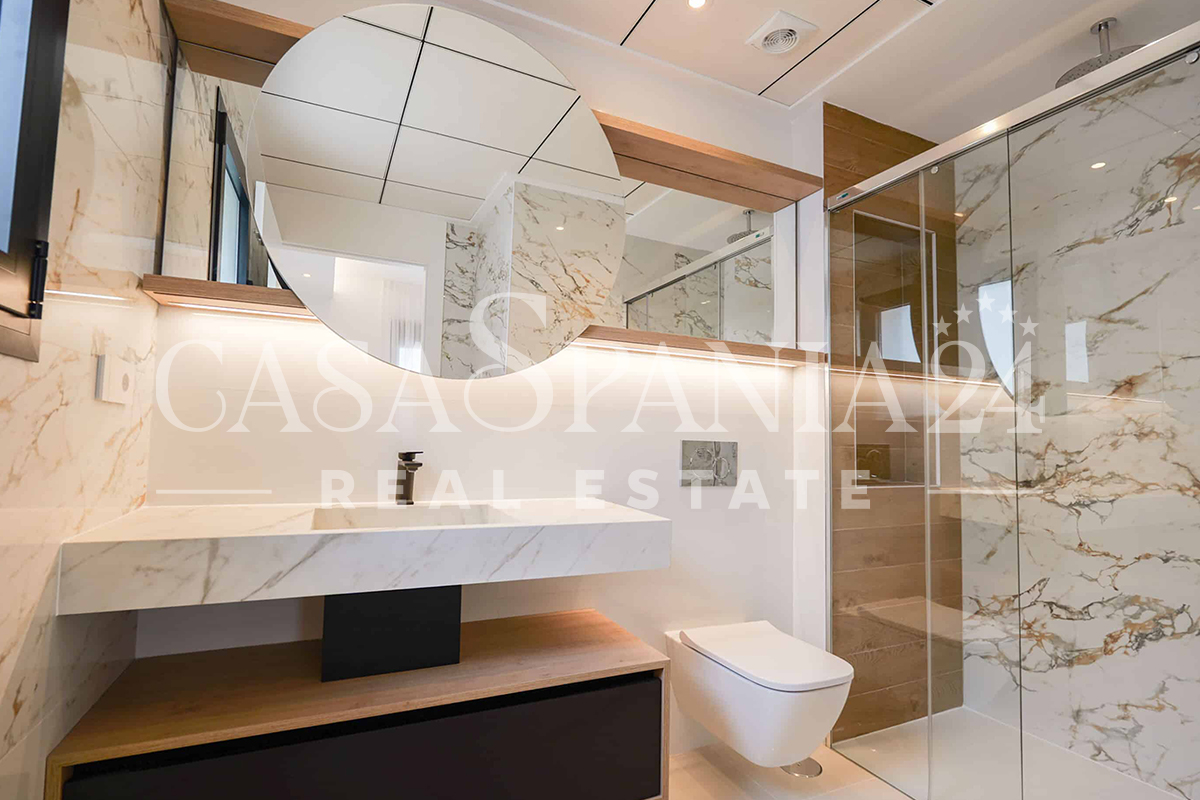 This property comprises of three double bedrooms, three bedrooms (two en-suite), fully fitted modern kitchen with breakfast bar and open plan living/dining area leading to a large tiled terrace and private . at the front of the house, and small terrace with stairs to the roof solarium at the back. The open plan layout works well and allows plenty of natural light into the living areas.